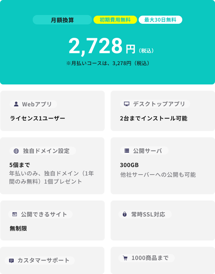 月額2,728円〜サイト運用に必要な機能を搭載