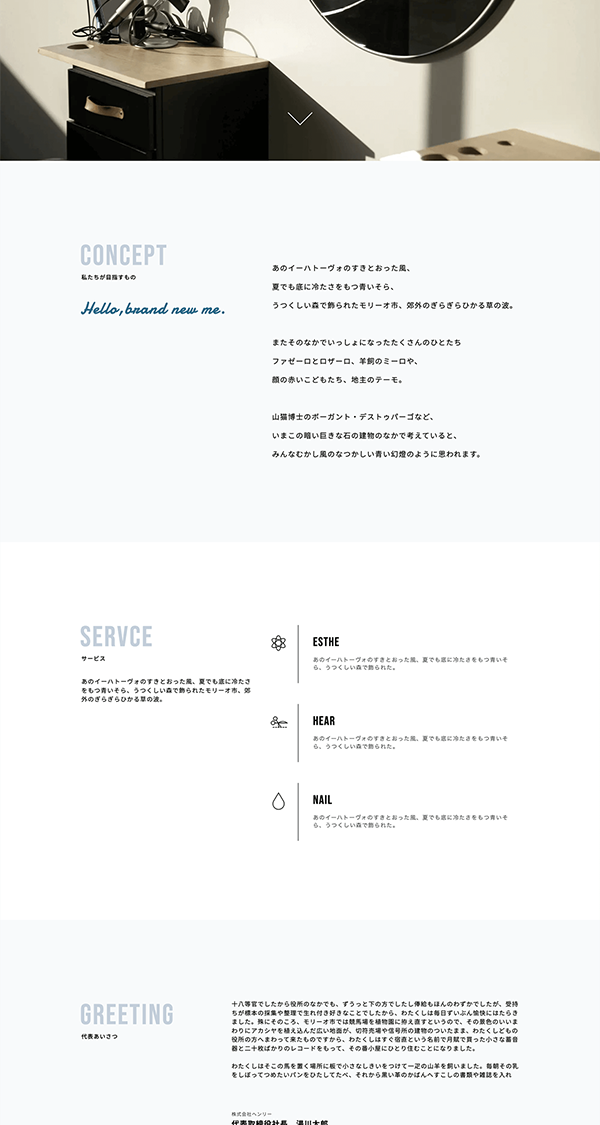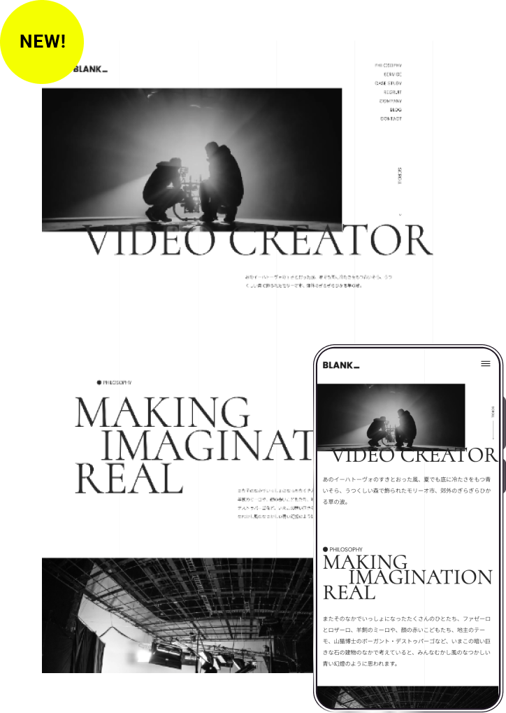 動画制作会社のコーポレートサイトを想定。色数は少なめに抑え、インパクトのあるタイポグラフィをあしらってスマートなイメージを打ち出します。