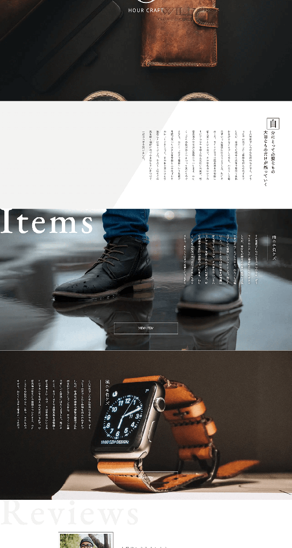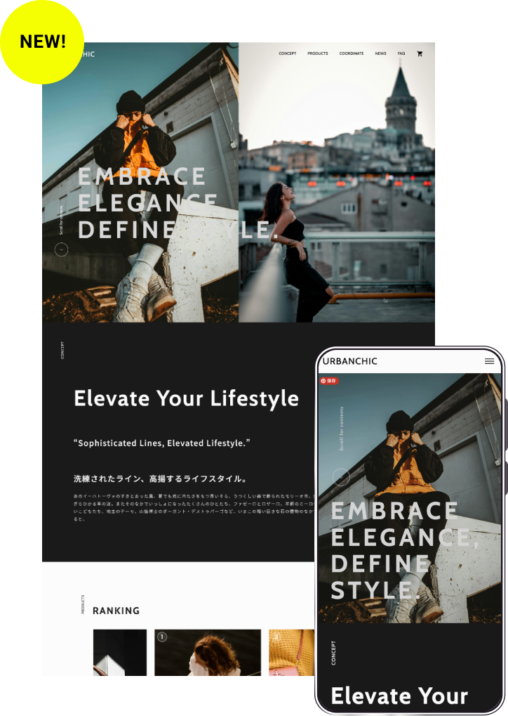 スプリッドスクリーンのファーストビューにスライドショーで動きをプラス。アパレルブランドのオンラインショップを想定し、多数の画像をバランスよく掲載できます。