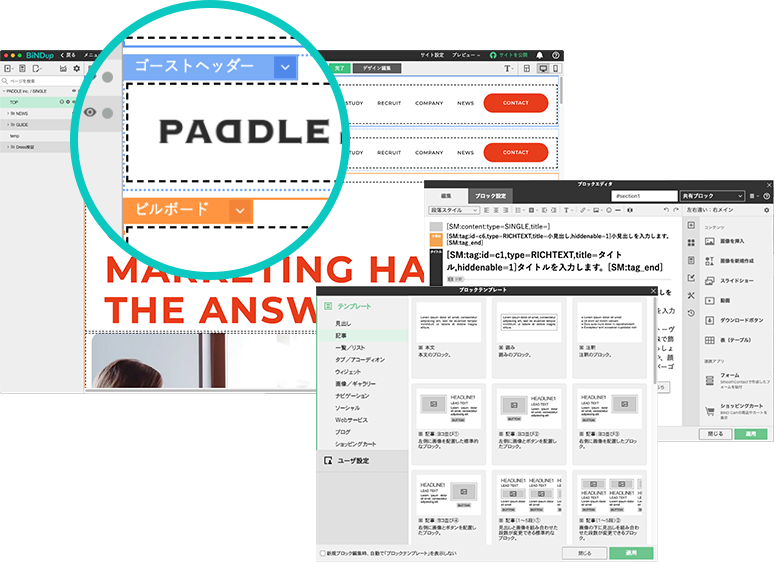 BiNDupはHTMLやCSSなどのコードの記述をすることなく、ノーコードで自由なデザインのサイトを作成・運用できます。
