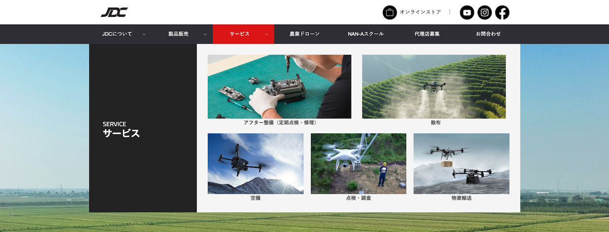 ジャパンドローンセンターWebサイトのナビゲーション|ユーザーの訪問時の目的に対して、辿り着くページがわかりやすく整理されている