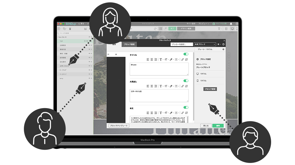 最大20アカウントまで発行可能。担当者ごとにページ制作や更新作業を分担でき、確認・修正のフローもスムーズです。属人化を防ぎ、組織として安定したサイト運用を実現します。
