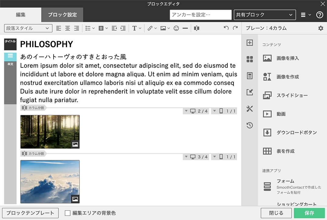 各ブロック内は、用意されたレイアウトの中でタイトルや記事、写真を編集する「スマートモード」と、専用エディタにテキストや写真を貼り付けて自分で自由にレイアウトしていく「エディタモード」の2つから編集方法を選べます。「スマートモード」は、必要な要素をフォームに入力するだけなので、ブログ感覚の簡単さ!レイアウトの崩れを気にしたり、何度も細かく調整したりする手間が省け、スムーズに思い通りのページができあがります。
