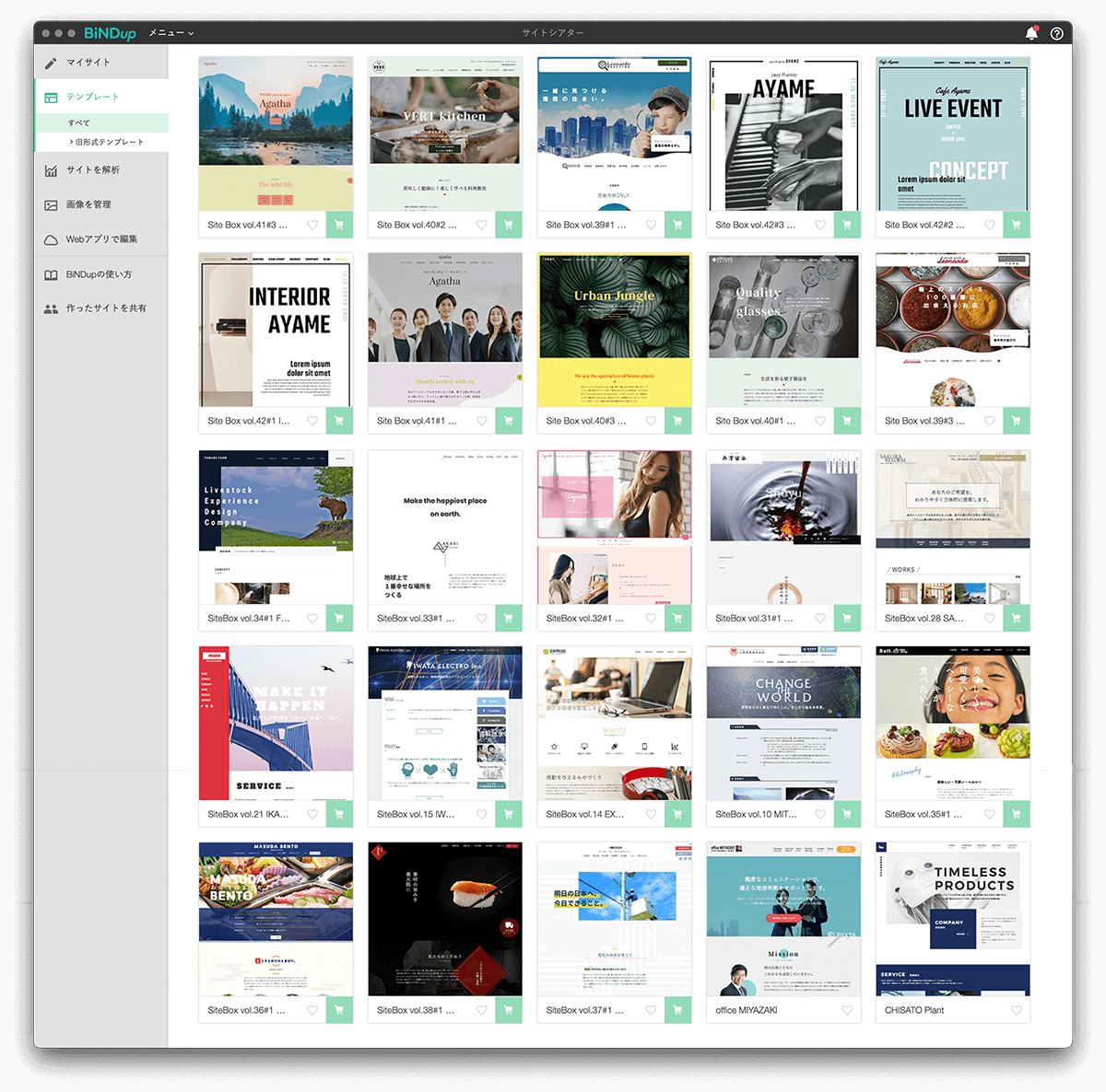 400種類以上のテンプレートの他にも、お気に入りのデザインを追加することが可能です。BiNDupのテンプレートの選択画面「サイトシアター」にてご購入いただけます。